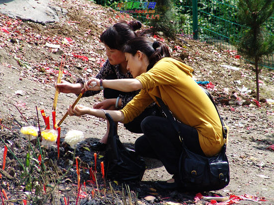 墓前香烟缭绕,鲜花簇簇,有人放声哭诉,有人轻轻低语……狭小的坡地上,承载着成千上万人的泪水与思念。