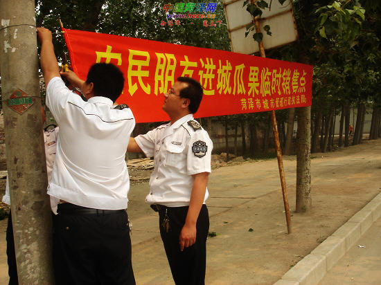 6月14日上午,菏泽开发区行政执法人员在市区太原路南段设立瓜果临时售卖点。近日瓜果大量上市,一些瓜农占道经营,不仅影响市容,也给交通安全带来隐患。城管行政执法部门在市区长江路、太原路、曹州路、丹阳路、黄河路等路段设立瓜果临时售卖点,以方便瓜农进城销售。