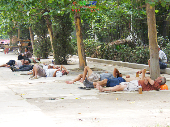 午间烈日当头,一群农民工躺在路边的树荫下聊天小憩,十分享受。7月15日,记者摄于市太原路。刘锦 摄