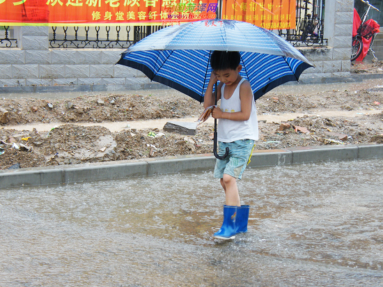 一男童打着雨伞,穿着胶鞋,踩着路边的积水,享受下雨带来的快乐。7月13日,记者摄于市和平南路。刘锦 摄