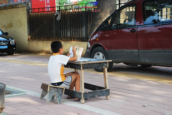 近日,气温日渐升高,一个孩子将书桌摆在了大街上的绿化树下学习。 培军7月14日摄于市实验小学附近