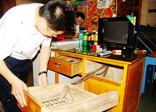在证实该电玩室接纳未成年人后,记者随后向该县文化市场稽查部门进行举报,执法人员立即赶到现场进行检查。检查发现,该电玩室为无证经营,其中麻将机和老虎机为国家明令禁止在公共娱乐场所用于经营的机器。在执法人员准备收缴电玩机及相关设备时,老板却时刻不离地站在桌子一边,并企图用身体遮掩其中一个抽屉,执法人员强行拉开抽屉,才发现机关暗藏在此。在抽屉的底部,按序号整整齐齐装着19个电子操作按钮,19个按钮又分别巧妙地连接着19台麻将机,由于线路非常隐蔽,从桌子外面根本看不出有线路接入抽屉内,一般玩家更不会注意这些细节。