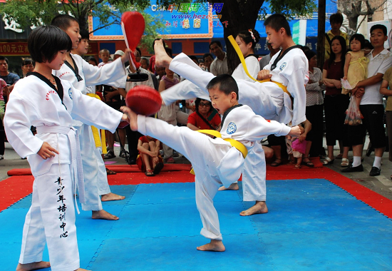 7月18日上午,市东方红大街的一沿街门市为招揽顾客,邀来一帮小孩搞起了跆拳道表演秀。