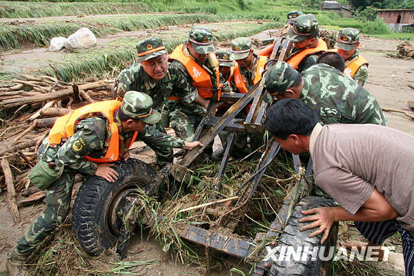 在米易县撒莲镇摩梭村,四川森林武警攀枝花市支队官兵帮助当地群众转移农机(7月27日摄)。新华社发(李泽江 摄)