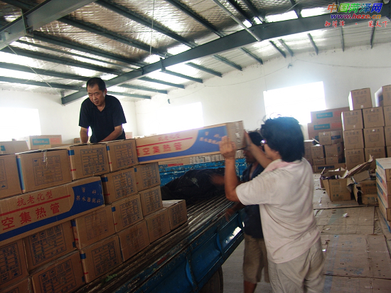 7月30日,菏泽市牡丹太阳能有限公司工作人员将50台太阳能热水器装上车,运往四川地震灾区。据悉,我市援建北川羌族自治县都坝乡的学校、医院等竣工后,牡丹太阳能有限公司专门捐赠了这批太阳能。