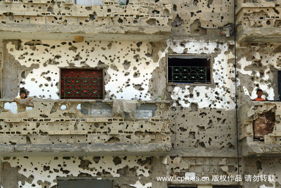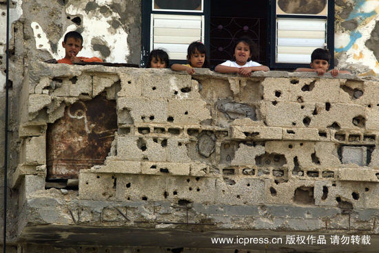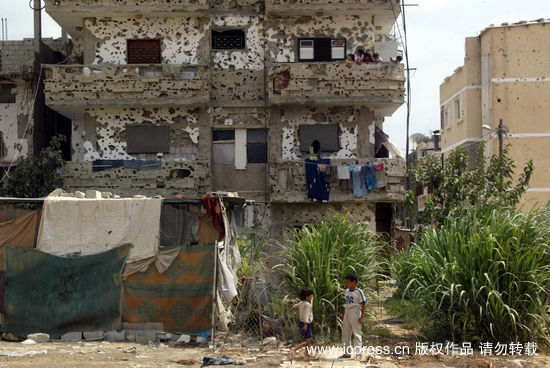 当地时间2009年8月10日,加沙地区拉法,巴勒斯坦居民的房子在经历了战火的冲击后已经弹痕累累,不堪重负。