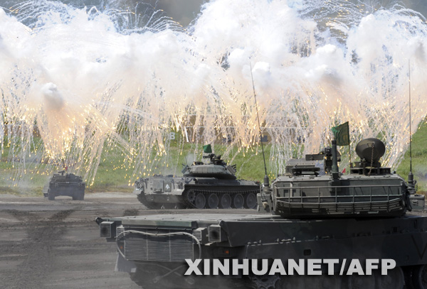 此次有约2400名自卫队士兵、80辆坦克和装甲车以及25架直升机参加一年一度的军演。 新华社/法新