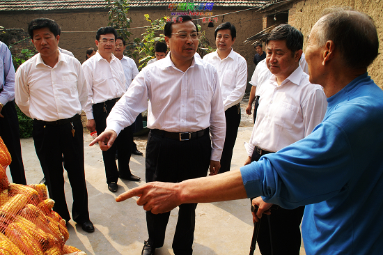 副省长才利民(左三)在田桥镇朱烟墩村生活困难党员张庆伦家中了解玉米收成情况。记者 董显增 摄