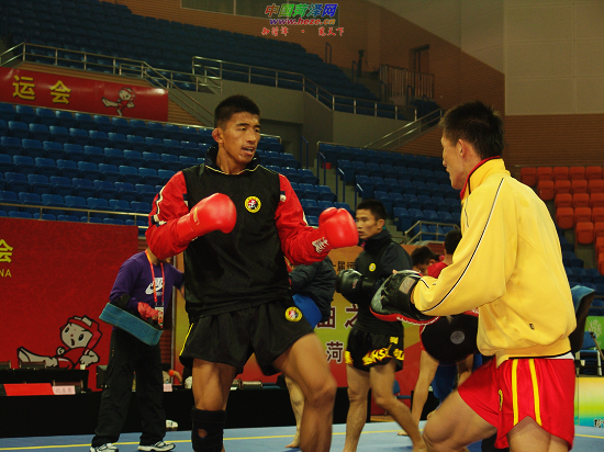这次来到家乡比赛,白近斌进行了充分的准备。他是本届全运会武术散打比赛77.5公斤级夺冠热门人物之一,然而在预赛时他右手受伤的消息不免让观众捏一把汗。图为白近斌在演武楼适应场地。