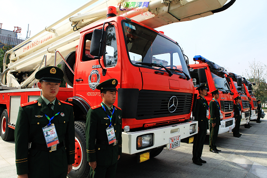 消防车、消防官兵严阵以待,防范于未然,确保比赛消防安全。