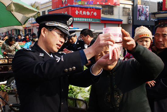 11月4日,定陶县公安局巡警大队民警在县城菜市场教群众鉴别假币。当前,制售使用假人民币案件时有发生,群众利益受到侵害,定陶警方派民警拿着近期出现的假币走上街头、农贸市场等地,向群众宣传防范、识别假币的方法。