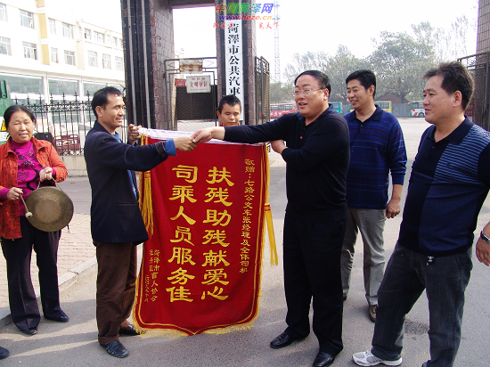 中国菏泽网消息 11月4日上午,牡丹区盲人协会的葛西标、马秀萍等几位盲人朋友将一面写有“拥残助残献爱心,司乘人员服务佳”的锦旗送到市公共汽车公司,表达他们对于公交车司乘人员的谢意。