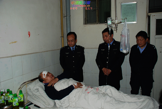 日前,鄄城县公安局负责人到医院看望在抓捕嫌犯过程中负伤的民警吴福海,并送来2000元慰问金。据了解,10月28日中午,吴福海下班后驾车行驶到鄄城县城一路口时,恰遇两嫌犯抢劫得手后驾乘摩托车逃窜。听到群众呼救,吴福海驾车追赶,嫌犯因惊慌失措摔倒。当时已追得很近,为避免撞人,吴福海急打方向盘,车撞在路边电线杆上。吴福海不顾自己头部受伤,迅速冲出车外,将其中一嫌犯制服。另一嫌犯被见义勇为的群众摁住。目前,两名嫌犯已被刑事拘留。