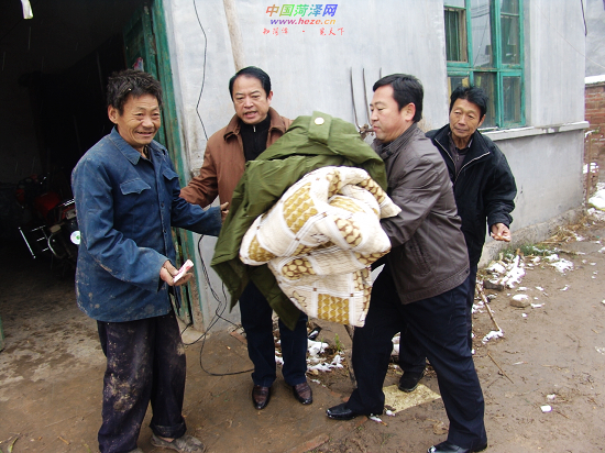 图为市民政局有关负责人向牡丹区沙土镇穆解村特困村民吕奇江老人赠送棉衣被。