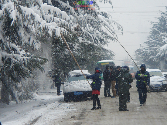 为防止树枝因积雪过多而折断,开发区园林管理处的工作人员冒着风雪帮树枝“减负”