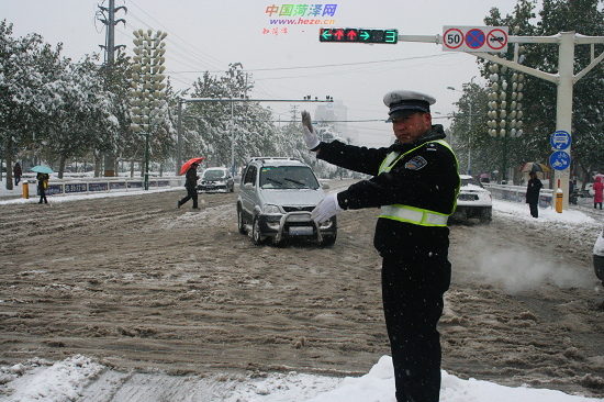 在中华路与牡丹路交叉路口,交警正在大雪中指挥交通