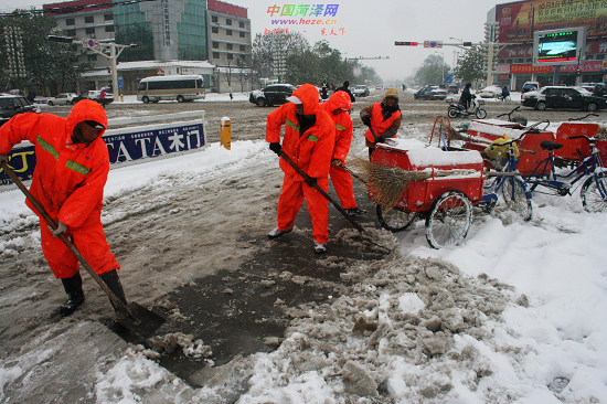 湿滑的路面造成了诸多交通事故隐患,环卫工人在市区各主要路段集中清理积雪