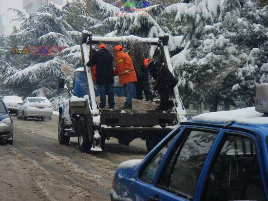 为保障车辆安全通行,开发区园林管理处的工人们对积雪结冰路段人工撒防滑料