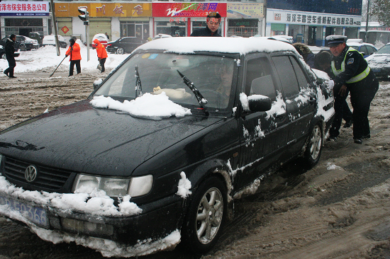 雪厚路难行,不少车辆都“趴了窝”,热心的交警帮司机推车