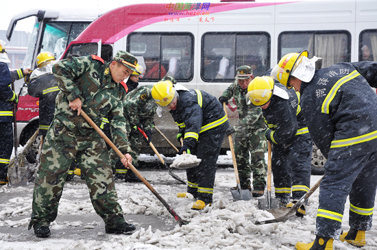 武警菏泽消防支队出动45名消防官兵在菏泽汽车总站内清理积雪,确保旅客出行安全
