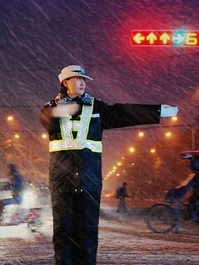 11日17时,下班高峰期,“警花”在中华路女子岗正在冒雪执勤