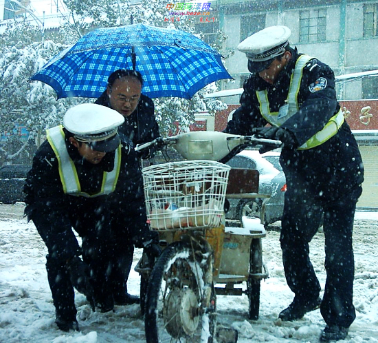 11月11日,一场大雪给初冬的菏泽增添了几分浪漫气息,也给人们的出行带来了很大不便。不管是行人、自行车,还是机动车都放慢了速度,但仍有或摔到、或抛锚、或磕碰的事发生着。在这样的时候,交通压力以前所未有的态势挑战着交管部门的应急处置能力。