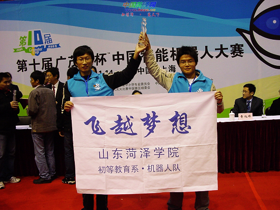 在刚刚落幕的第十届“广茂达”杯中国智能机器人大赛上,菏泽学院初等教育系指导教师宋保红、学生郜晨、李西卫代表菏泽学院参加比赛,并荣获智能机器人吸尘项目比赛第一名。据悉,此次比赛在上海工程技术大学举行,来自全国24个省市及各高校的350多支代表队参加了比赛,参赛队伍与人数均为历史之最。图为领奖现场。