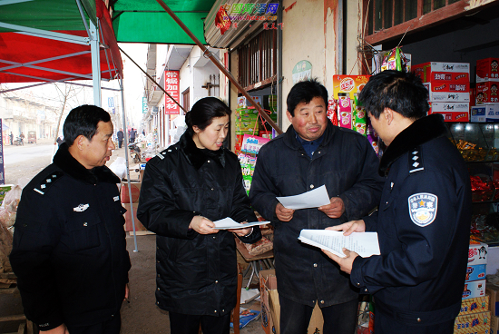 日前,东明县公安局民警正在向武胜桥乡一位个体商户发放烟花爆竹整治行动宣传材料。据了解,我市开展烟花爆竹整治专项行动开展以来,东明县公安局把宣传发动工作作为重要日程,在全县开展了轰轰烈烈的宣传活动。