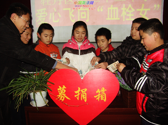 12月23日下午,牡丹区第二十二中学举行向“血栓女”袁合英奉献爱心捐赠活动。同学们专门制作了一个“心型”捐款箱,师生争相奉献爱心,当场募集善款8000余元。该校学生宋宁捐款后对记者说:“从牡丹晚报上了解袁合英一家的遭遇后,我们都很牵挂。希望袁合英阿姨尽快康复,走出困境。”