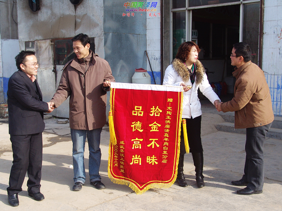 中国菏泽网消息 2009年12月29日,市民张显与同事来到定陶县西关一羊肉汤馆,将一面绣有“拾金不昧,品德高尚”内容的锦旗送到店老板和服务员手中,以感谢他们捡拾了自己的皮包。