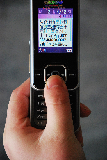 李先生介绍,4日凌晨2时39分,他还在睡梦中,他的手机突然收到一条短信。他打开短信一看,不禁乐了,原来短信的内容是:“爸妈,我和异性同宿被查,速存5000元到李警官的卡上,工商银行:6222023602040697XXX,户名:李静怡。”短信还提醒李先生先“不要拨打电话,等我从派出所出来再说”。现年25岁的李先生还没有结婚,这条求助短信显然是骗人的,让他又气又好笑。想到个别家长收到此类短信可能上当受骗,李先生赶紧拨打了本报热线。