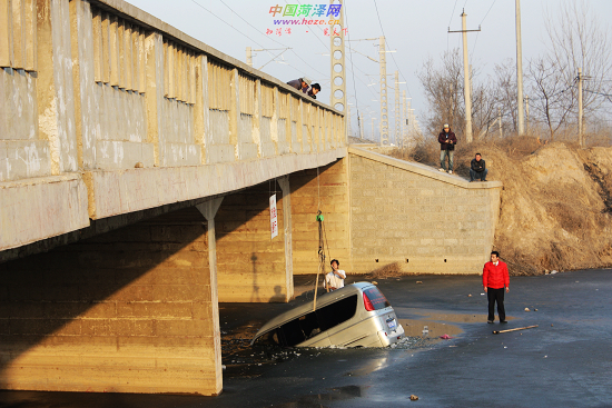 中国菏泽网消息 1月14日,一辆面包车从菏泽市南京路北段铁路桥下通过时坠入冰窟,正在附近施工的一名小伙子闻声赶到,奋力将车上两人救出。