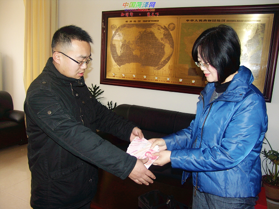 1月18日下午,牡丹区西城办事处育才社区居民董超(图中左)从牡丹区民政局工作人员手中领取了3100元大病医疗救助金。去年,董超一岁的女儿被诊断患上脑梗塞,为治病已花费7万元,家中负债累累,董超随申请了大病救助。当日,牡丹区共向全区600户特困大病医疗患者发放了100万元的救助金。