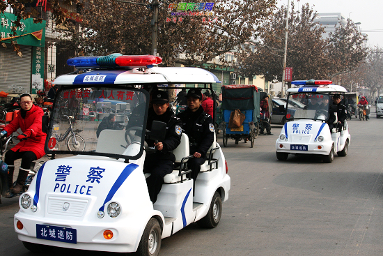 1月18日,市公安局牡丹分局北城派出所民警驾乘新型巡防电车在街头巡逻。北城公安派出所日前投资6万余元购置了两辆新型巡防电车,用于街头治安巡逻、群众救助、处置突发案件等。