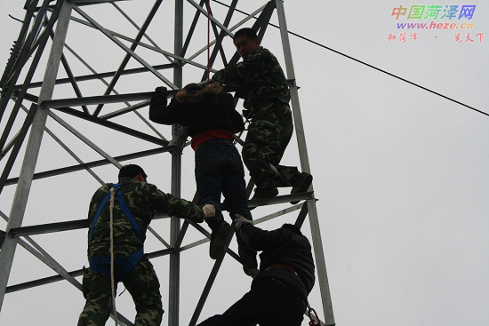 3月1日9时40分,东明县公安局陆圈派出所接到报警称,陆圈镇郑旗庄村一青年因与家人闹矛盾,攀爬到27米高的角钢塔上,情势十分危急。东明县公安、消防、卫生、供电等部门迅速派人赶到现场,紧急成立现场救援指挥部,制订了救援方案。救援人员一靠近角塔,塔上青年就扬言往下跳,拒绝接受救援,致使安全气囊、安全网无法使用。在与该青年进行了7个小时的沟通之后,消防官兵和青年的家人一起爬上角塔,将安全绳索栓在该青年的身上。17时35分,该青年被安全救下,送往医院治疗,目前已脱离生命危险。