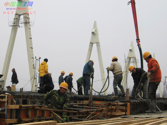 3月3日,赵王河长城路桥工程正在浇铸快车道镶梁混凝土。据介绍,长城路桥仿英国名桥金禧桥设计,横向共分3幅桥梁,中间为车行道,两侧为人行道,其中车行道为七跨预应力混凝土连续梁,人行道为六塔七跨斜拉桥。该桥由上海同济大学建筑设计院设计,市城建集团承建,2009年8月下旬开工,目前已完成总工程量的三分之二,预计今年牡丹花会前快车道可通车。