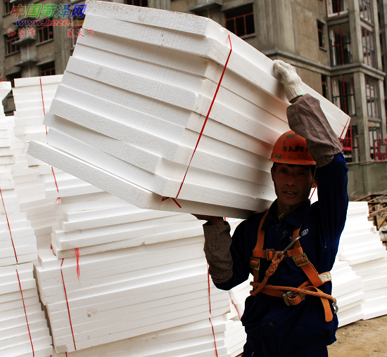 为了体验外墙保温施工的艰辛,记者随同吕令川一起乘坐升降架来到30多米的高空。虽然有安全带等保护措施,记者第一次体验还是有些害怕,向下望去,地面上的人变得非常小,并且有眩晕感。“第一次上来都是这样,慢慢就习惯了。”看到记者的表情有些不自然,吕令川安慰道。看到吕令川和工友们有说有笑、如履平地,记者对他们充满敬佩。