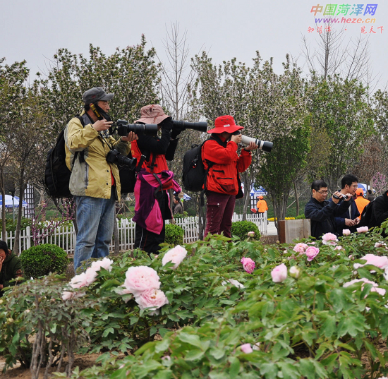 中国菏泽网消息 4月19日上午,来自辽宁省丹东市的10名业余摄影爱好者,手持“长枪短炮”,在曹州牡丹园内拍摄牡丹。