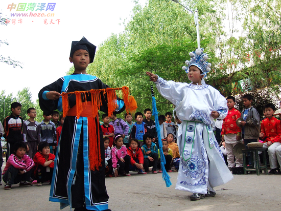 学唱柳子戏,塑造完美人格。郓城县陈坡乡中英文学校把传统戏曲教育引入第二课堂,取得了明显的育人效果,不仅丰富了农村留守儿童的素质教育,还让这一濒临灭绝的戏曲化石得到保存和发展。图为日前学生们正在表演传统柳子戏选段打登洲。