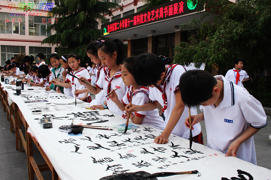 儿童节前夕,牡丹区第二小学举办第十一届科技文化艺术周,主要活动包括师生书法展演、师生自编自导文艺专场演出等。图为60余名小书画家当场作画。