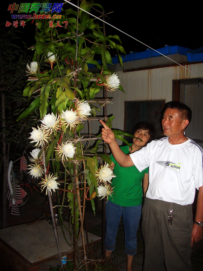 9月12日晚10点许,在菏泽城区双井南街的退休老干部姜永锦家,沁人心扉的清香洋溢在整个小院。原来是昙花开花喽!在短短的一个小时内,昙花就由花骨朵转成了怒放姿态,有的一片叶子上竟开了两朵。盛开的昙花,怡人的清香,引得街坊邻居纷纷前来观赏。据花主人姜大爷介绍,这株昙花已养了11年之久,从最初的一片断叶,长成现在的足有两米多高。每年9月份的这个时候,昙花都会在夜里静静绽放。图为姜大爷在为邻居们讲解昙花的习性。