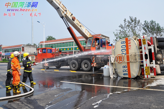 10时10分,市公安局副局长祝兰华、市消防支队参谋长孙宝策以及当地办事处主要领导也相继到达了现场。与此同时,距离事故现场较近的定陶县消防中队和菏泽开发区消防中队的消防官兵也到达现场。事故现场立刻组成临时指挥部,并经过认真研究后决定:由特勤中队中队长丁俊成带领四名战士组成堵漏小组对罐体进行堵漏;由一中队指挥员郭良记带领12名战士利用泡沫枪继续对流淌出的汽油进行稀释和覆盖。其他消防战士则随时准备预防罐车爆炸。同时,立即调来两辆50吨吊车和一辆新油罐车对事故油罐车槽内的汽油进行疏转。