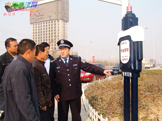 26日上午,巨野县公安局局长李昌柱向县城居民介绍“智能警察”的功能和使用方法。为确保社会治安稳定,巨野县公安局近日在县城主要交通路口安装了10个“智能警察”。“智能警察”集音频、视频和监控系统于一体,四面装有监控摄像头,并配有报警按钮。报警人按下“智能警察”身上的报警按钮能够与110接警中心民警进行实时语音交流,110接警人员同时可通过监视器看到报警人周围情况,提高接处警效率,有效震慑犯罪。“智能警察”由巨野县公安局自主研制,在全省处于领先水平。