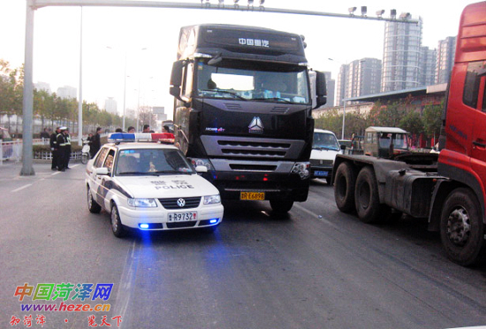 据警方介绍,当时,这辆重型半挂牵引车沿牡丹路由南向北行驶至长江路路口,将一名骑自行车的妇女撞倒,右转弯沿长江路逃逸。正在附近执勤的市交警支队市区大队民警吴德华、曾兆贝听到附近群众呼喊,立即跑到现场,了解情况后,一边向上级汇报,一边呼叫救护车。
