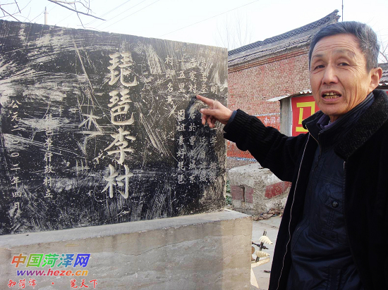 记者注意到,石碑上面雕刻着“琵琶李村”四个大字,大字的旁边用古汉文抒写着该村搬迁的历史:“明洪武二年(1369年),钦拨为至圣,迁自诸城李家村,居于曹州城东十五里,因祖素好琵琶,村即名焉。”
