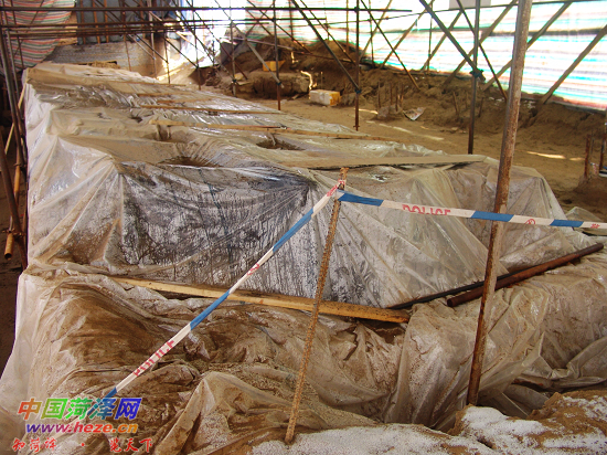 3月1日上午,记者在菏泽城区古沉船遗址看到,沉船上方搭建的防护棚顶上堆满积雪,融化的雪水不断往下流淌。防护棚内没有积水,空气比较干燥,沉船被封闭在塑料薄膜内,保护措施完好。据了解,沉船整体出土工程非常庞杂,具体出土时间还需要进一步研究。
