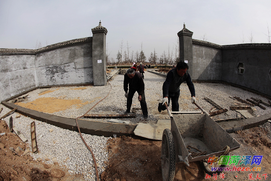 3月23日,在曹州牡丹园南大门建设工地,工人们正在施工。为使曹州牡丹园变得四通八达,方便游客进出,曹州牡丹园今年新开建设南大门。南大门位于国花馆的西南方向,宽6米,设有临时售票厅,正对天香路,出门往南100米,可与长城路交汇。目前工程已接近尾声。