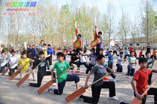4月11日下午,曹州武术馆82名武术运动员在演武场上排练节目,备战即将举行的2011菏泽国际牡丹花会开幕式大型文艺演出。据了解,应花会开幕式导演组邀请,曹州武术馆名誉馆长、著名武术编导徐学礼编排了《古船·武魂》节目,其中不仅展现了大刀、长斧、霸王鞭、双锤等传统兵器,还有渔民、兵器、船桨,以及由运动员组成的古船造型,体现了我市出土元代古船这一重大考古发现。