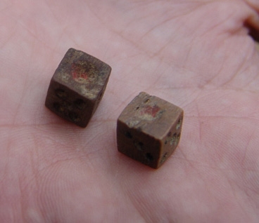 在当日下午的发掘清理中,考古队分别在原三号船舱部位下边发现骰子两个,木构件一个,铁钩一只。两个骰子大小相同,均为四方体,边长约一厘米左右,六面皆有点数,呈朱砂色,其材质经现场初步判断,应为象牙或其他骨质所制,真实情况有待日后室内清理时进一步证实。孙明表示,实物类的骰子在历史遗存中少见,它们将为今后深入研究元代生活习俗、考察古代娱乐类器物提供确凿的实据。于原船头部位下边的地层中,考古队清理出一把剪刀和一盏铁灯;同部位还发现两个铁器,形状分别为长柄、一端带弯月状铁构件,因十分少见,目前尚不清楚其名称和用途。在原沉船中部土层下边右侧积沙中,考古队还发现了已经腐朽的席子,由于历时弥久,极度腐朽,已不可取出。