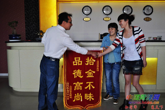 “菏泽人好样的!感谢拾金不昧的菏泽人!”5月16日上午,丢失“贵重”皮包后又意外找到的上海客商王德友,将一面锦旗送到菏泽丽泽宾馆服务员蒋伟手中,并连声道谢。